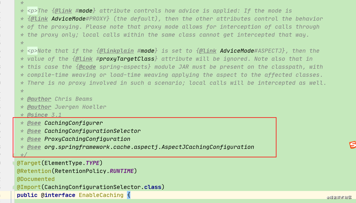 我们是通过@EnableCaching进行缓存启用的,因此可以先看@EnableCaching的相关注释